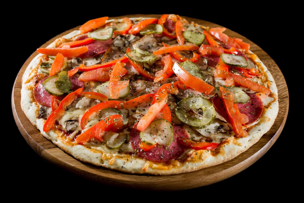 Padažas, sūris, saliamis, pievagrybiai, šoninė, pomidorai, šviežios paprikos, marinuoti agurkėliai, česnakų ir prieskoninių žolelių aliejaus padažas, raudonėliai